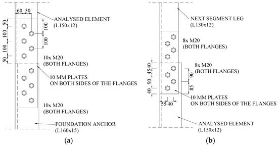A total of five models of reinforced tower legs were created. Four models, each measuring 5 m in length, excluding the tower bracings, differed in the manner in which the reinforcing branches were connected to the reinforced L-section, thereby enabling a study of the effect of this connection on their cooperation and the form of buckling. Additionally, a fifth model, measuring 5 m in length, included the tower bracings as so-called related members. This model was designed to be the most accurate representation of the existing tower leg. The connections at both ends of the tower legs were modeled based on the archival design of the analyzed structure, as lap bolted connections with M20 bolts (Figure 6). This took into account the significant effect of their finite rotational stiffness on the buckling length of the elements [40,41,42].