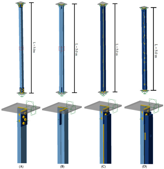 The characteristics of the models not including the bracing members (Figure 7) are shown in Table 4. Model A corresponded to the unreinforced tower leg and served as the reference model for the remaining analyses. In Model B, the reinforced tower leg was modeled as a composite section, ensuring that the L-section and channels fully cooperated and that both the L-section and channels were connected to the theoretical support elements. The consequence of modeling the element in this way was the simultaneous application of compressive force to all its branches. In model C, the channels were modeled as stiffening elements welded to the L-section, while model D represented the actual existing reinforcement, i.e., the channels connected to the L-sections by bolted connections. In models C and D, the reinforcing channels were not connected to the support members, and the compressive force was applied only to the L-section, as is the case in the existing tower leg.