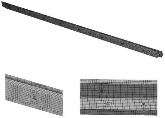 Quadrangular finite elements were used (Figure 9). On the largest web or flange of the element, 8 finite elements were adopted each time. The maximum element size in the models was, therefore, approximately 20 mm. For plates, 10 finite elements were modeled along the shorter side of the plate (element size approx. 12 mm).