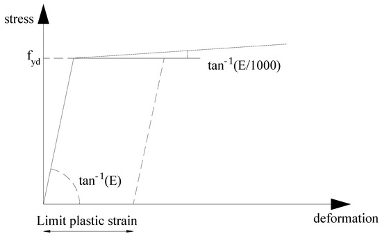 The stress analyses carried out used an elastic–plastic steel model with a nominal slope of the yield plateau according to [27] equal to tan−1(E/1000) where E is the elastic modulus of the steel (Figure 10). The behavior of the material was based on the von Mises criterion of plasticity, assuming that it is elastic before reaching the design yield stress fyd [24].