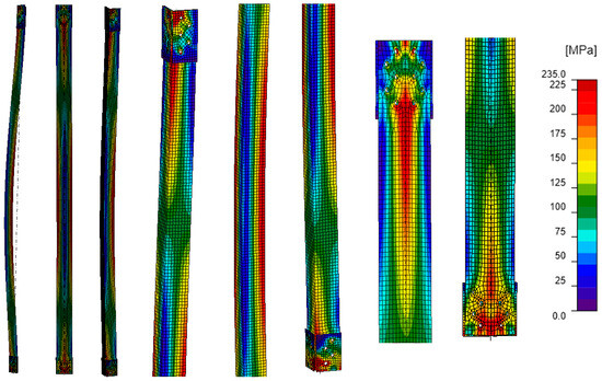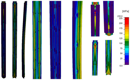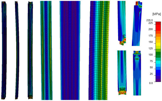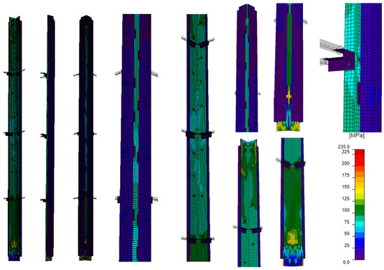 The analysis for each of the models created was carried out in three stages. It began with materially nonlinear analysis (MNA), followed by linear buckling analysis (LBA), and concluded with the most complex, geometrically over materially nonlinear analysis (GMNIA). A series of checks were conducted to ascertain the stresses arising in the individual components of the reinforced tower leg, their respective deformations, the form of buckling, and the critical forces. Each analysis was carried out in an iterative manner, gradually increasing the applied load until the full load set in the input parameters of the analysis was reached or until the components exceeded the ultimate limit state, defined by the deformation’s limit, which was assumed equal to 5% as recommended by the standard [27].