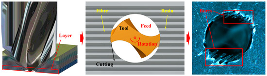 It could be found that the majority of FE models established in recent studies for simulating CFRP drilling were built on the assumption of an equivalent homogeneous material (EHM), in which each layer of the composites was considered to be homogeneously equivalent. Moreover, these simulations were focused on the research of delamination. However, the burr is also a significant damage mode that occurs in CFRP drilling, yet it was seldom investigated numerically. Overlooking this type of damage in FE modeling would impede the accurate prediction of the mechanical behavior of drilled composites. The reason could be attributed to the fact that the burrs can accelerate the initiation and growth of delamination, as well as fiber pull-out due to the continuous scraping of the drill bit edges. Furthermore, although burrs can be removed through post-processing, this adds to the overall processing time. Consequently, to improve the drilling quality and efficiency, the formation mechanism of burrs, as well as its variations with the tool geometries and processing parameters, should be figured out. It is important to point out that the formation of burrs is largely dependent on the localized deformation and failure process of the fiber and resin phases on the micro scale (see Figure 1). Simulations based on the EHM assumption, which neglects the interaction of the drill bit with fibers and resins, are clearly unsuitable for studying burrs [22]. Under this circumstance, a numerical model that incorporates both fibers and resins should be developed to explore the mechanisms behind burr formation and to further reveal the impact of processing conditions on this type of damage.