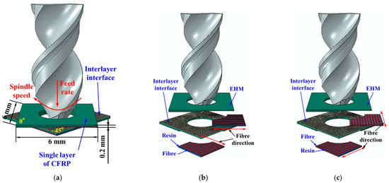 The tie constraint method was employed to bind the fiber–resin combined zone, EHM, and interlayer interface together. For the nodes on the outer edge of the workpiece, all their degrees of freedom were restricted to prevent the CFRPs from moving. The movement of the drill bit in its radial direction was limited, and the rotational and translational velocities along the axial direction were set to the drill body, representing the spindle speed and feeding, respectively. The drilling parameters adopted commonly used values [4,25], as listed in Table 1.