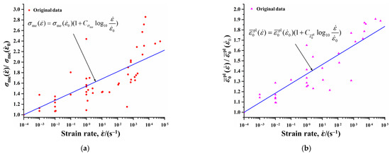 The above damage model could describe the mechanical response of resin under quasi-static loadings. However, the mechanical properties of resins vary substantially with the change in strain rate. Therefore, to ensure precise prediction of CFRP cutting, it is crucial to further incorporate the strain rate effect into the simulation. Nevertheless, in existing studies on CFRP cutting modeling, the variation in strain rate (e.g., in Equation (11)) and its impact on the mechanical properties of resin were often ignored. To address this gap, the present work identified the mechanical properties (i.e., σme, ) of resin across varying strain rates by referring to studies [40,41,42,43,44,45] first, and they were normalized to serve as the original data (represented as points in Figure 3). Then, the variation functions of σme and with respect to strain rate were fitted with a developed MATLAB 2017a (MathWorks, Natick, MA, USA) program and the original data, as shown by Equations (14) and (15) (see curves in Figure 3a and Figure 3b, respectively). Subsequently, these functions were implemented into the elastoplastic constitutive relationship and damage initiation criterion of the resin, respectively. In this manner, the mechanical response of resin at different strain rates during the CFRP cutting process was modeled.