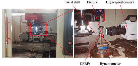 In this study, drilling experiments were performed to validate the multiscale numerical model. The material removal process at the hole exit during the drilling of multidirectional CFRPs was experimentally observed, and the thrust force was measured. These experiment results were compared with the simulation outputs. Details of the experimental setups and simulation validations are described in this section.