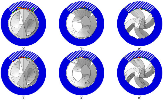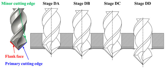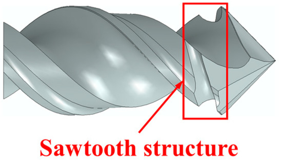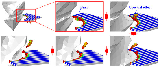 For the drill bits without a sawtooth structure, the most serious burr damage was produced by the twist drill, and the burr factor was approximately 0.14. The burrs were suppressed when utilizing the step drill and the one-shot drill, and the burr factors were about 0.06 and 0.04. The minor flank of the step drill was larger than that of the twist drill, which increased the compression effect of the cutting edges on the workpiece, leading to reduced burrs around the processed hole. The second point angle of the one-shot drill was 20°, which was far less than that of the step drill and the point angle of the twist drill. With smaller point angles, the pushing effect of the tool on the fibers at the hole exit was weaker, and the fibers were less likely to undergo out-of-plane deformation, resulting in significantly decreased burrs. In addition, it could be concluded from Figure 16 that the burrs were suppressed after using tools with a sawtooth structure. The reason can be explained by analyzing the drilling process of the twist drill with a sawteeth frame by frame, as shown in Figure 17. After the initial burrs were formed in the drilling process, the sawtooth structure could exert an upward cutting effect on burrs during the downward feed of the tool. Due to the strong constraint effect of the material above the fibers at the hole exit, the fibers were less likely to undergo out-of-plane deformation, and they were easily removed; thereby, the burrs were inhibited. Since the twist drill has been commonly applied in industrial production while the burrs induced by it were the most serious, the following parametric studies were conducted with the twist drill.