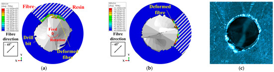 Generally, the damages in CFRP drilling could be observed and measured directly with the experimental method. In the existing investigations, advanced equipment, including high-speed cameras, was adopted to observe the damages at the drilling exit of CFRPs, and the material fracture and damage propagation at the exit were analyzed [9,10]. The influences of tool geometry, spindle speed, and feed rate on the drilling quality were experimentally studied by using drill bits such as one-shot drill and twist drill [11,12]. Moreover, based on parameter analysis and multiple linear regression, empirical formulas were reported to predict delamination factors under different processing conditions [13,14]. However, due to the high cutting speed in drilling, it is hard to clearly observe the formation of the damages at hole exit based on existing equipment, and the measurement of the damages inside the CFRP workpiece is more difficult. When studying the effect of processing conditions on drilling damage, a large number of experiments are often required, which would waste a high volume of composite materials. Furthermore, the empirical formula used to predict the damages is only effective within a certain range of parameters.