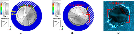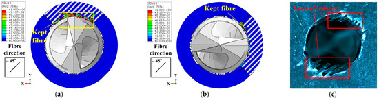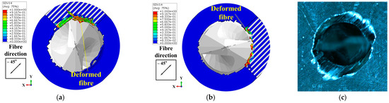 Figure 2 illustrates the geometrical model of the multiscale numerical model. The workpiece was defined as a deformable solid, which consisted of carbon fibers, resins, interlayer interfaces, and CFRP layers that were treated as EHM. To reduce the computational time while ensuring precision, several strategies were adopted to optimize the geometric model of the CFRPs. Firstly, the workpiece was simplified to only two plies with a stacking sequence of 0/−45 (see Figure 2a). Secondly, considering that the diameter of the tool has less effect on the drilling-induced damage of CFRPs [23], the diameter of the hole supposed to be processed was determined to be 4 mm to reduce the size of the workpiece. Consequently, the dimension of each single layer in the workpiece was defined to be 6 mm × 6 mm × 0.2 mm. Thirdly, a 3 mm diameter pre-drilled hole was defined on the workpiece to minimize the number of integration points included in the calculation. Fourth, the cutting action on fibers under 0° to 180° cutting angles during the drilling was divided into two simulation processes named Simulation-I (see Figure 2b) and Simulation-II (see Figure 2c) for parallel computation. To be specific, Simulation-I was utilized to predict the cutting of fibers under 0° to 90° cutting angle, while the fiber cutting angles in Simulation-II covered from 90° to 180°. Fifth, a multiscale modeling was adopted during the simulation. As shown in Figure 2, only a small area in each CFRP layer was defined to be a fiber–resin combined zone, and the other part of the CFRP layers was assumed to be EHM. The fiber–resin combined zone was further divided into a fiber zone and a resin zone based on the fiber volume fraction. Moreover, zero-thickness cohesive elements were used to simulate the interlayer interface, which bonded the CFRP layers together. The material distributions and fiber orientations in Simulation-I and Simulation-II are shown by Figure 2b and Figure 2c, respectively.