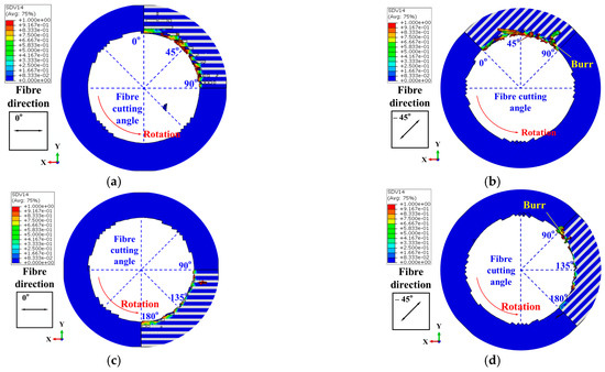 During the machining of CFRP laminates, different damage modes would initiate [48]. Therefore, this work utilizd Hashin–Puck combined criteria to predict the damage initiation of the EHM [28,49,50,51], and four distinct failure modes were defined individually.