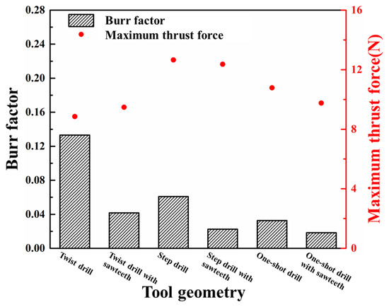 Variations in the burr factor and maximum thrust force with tool geometry.