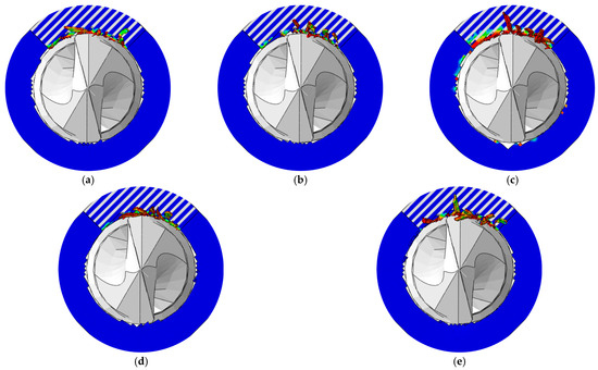 Burr distributions in the drilling of CFRPs at various spindle speeds: (a) 2000 rpm; (b) 3000 rpm; (c) 4000 rpm; (d) 5000 rpm; and (e) 6000 rpm.