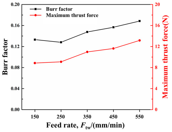 Figure 18 illustrates the predicted burr distributions in drilling CFRPs with the twist drill at various feed rates and 3000 rpm spindle speed. The changes in the burr factor and maximum thrust force with the feed rate are shown in Figure 19. It can be seen from the results that the burr factor raised from about 0.14 to about 0.16 with the increase in the feed rate from 150 mm/min to 550 mm/min, and the maximum thrust force gradually increased from around 8 N to about 13 N. With higher feed rates, the pushing effect of the tool on the fibers was enhanced, leading to great out-of-plane deformation of the fibers. The fibers were hence more difficult to remove, and the burrs were increased. In addition, the increase in feed rate raised the cutting amount per tooth of the tool, thereby resulting in large maximum thrust forces.
