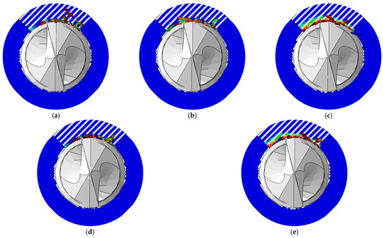 When the absorbed energy met the power-law criterion (see Equation (42)), the cohesive element failed, and a crack was formed in the interface.