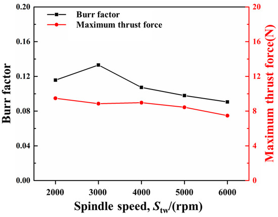Variations in the burr factor and maximum thrust force with spindle speed.