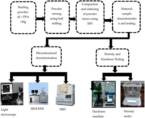 Al/Mg/PPA samples were fabricated using the PM method (Ball milling and SPS). The first stage in the processing sequence of the PM process involves powder mixing using a high-energy ball mill (PM 100, Retsch, Haan, Germany). The powder mixes were made according to the ratio presented in Table 1 and charged in a chromium steel vial with a ball-to-powder ratio (BPR) of 5:1 under normal atmospheric conditions. The powder mixtures were milled for 90 min at an average speed of 200 rpm. To prevent excessive cold welding and powder particle agglomeration, 1 wt% of propanol was added to the powder mixture. After every 30 min of milling, the milling machine was turned off for 10 min to prevent the milling vial’s temperature from rising [,]. The compaction and sintering of the milled powders were done using the SPS machine (8604 HHPD-25, FCT Systeme GmbH, Frankenblick, Germany), having a graphite die, a maximum compaction force of 250 KN, a working temperature of 2200 °C, a maximum sintering current of 8000 A, and a vacuum atmosphere. The die walls were covered with graphite sheets before filling with nine grams of the powder mixture. The graphite sheet prevents the sintered samples from sticking to the die walls, thereby facilitating their removal from the die. After the sintering time was completed, the sintering current was switched off to allow the samples to cool to room temperature. The graphite sheets, which formed additional layers to the sintered samples, were removed using a knife. The dimensions of the fabricated composites after the graphite sheet layers have been removed are 20 mm in diameter and 12 mm in thickness. The sintering parameters for this study are presented in Table 2. Figure 3 illustrates the flow chart for the fabrication of Al/Mg/PPA Composites.