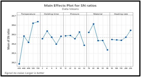 The results presented in Table 6 and Table 7 show that the material for the composites has the strongest influence on the hardness of the composites (rank 1), followed by the sintering temperature (rank 2), and so on; the holding time has the weakest influence on the hardness. The main effects plot for SN ratios shown in Figure 10 reveals that the optimal processing parameters for the best hardness of Al-Mg-PPA composites include a sintering temperature = 550 °C, holding time = 2 min, compaction pressure = 52 MPa, reinforcement concentration = 15 wt% PPA, and a heating rate = 200 °C. As evident from Table 7, the effect of material on the micro-hardness is statistically significant.