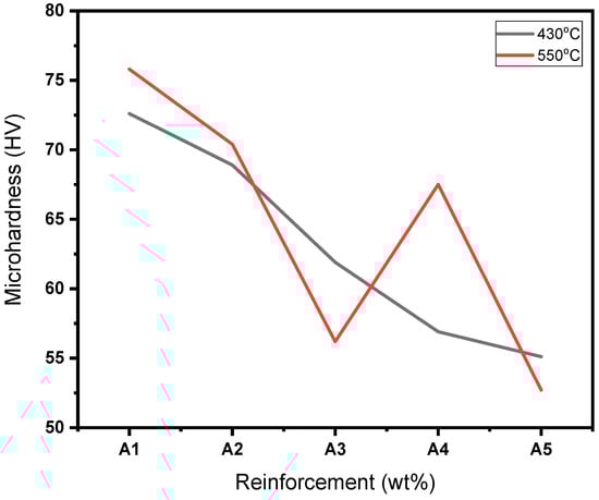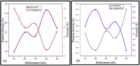 The porosities of the fabricated Al/Mg/PPA composites were estimated using Equation (4). Porosity in composites can be reduced but cannot be eliminated. As the RD decreases, the porosity of the Al/Mg/PPA composites rises, as illustrated in Figure 5. The main factors influencing the porosity levels of the fabricated composites include the reinforcement characteristics and the processing parameters [,].