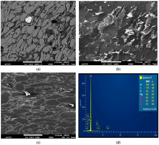 The homogeneity of the powder particles is vital for higher densification, while powder particle agglomeration results in increased porosity. It is obvious from the optical and SEM images that the Al, Mg, and PPA particles are homogeneously distributed with little to no considerable agglomeration. This indicates that high-energy ball milling is an efficient method for achieving powder particle homogeneity [,].