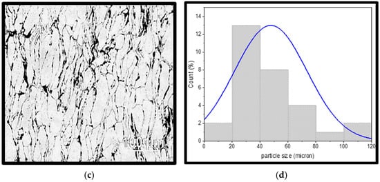 Additionally, composites densify more when fine and mixed grains are used because they pack better and have fewer pores than coarse grains. From the grain size distribution shown in Figure 8b,d using Image J software, version 1.54, it is observed that the grain sizes are mixed and range from 20 µm to 140 µm. When compared with the as-received powder particles, it can be inferred that some of the coarse grains have been fractured into finer particles through the process of ball milling and compaction. Powders with diverse particle sizes, shown in Figure 8, will minimize porosity and increase densification more so than powders with uniform particle sizes. For instance, in contrast to a combination of 20 µm (matrix) and 20 µm (reinforcement) or 120 µm (matrix) and 120 µm (reinforcement), a combination of powder particle sizes of 20 µm (matrix) and 60 µm (reinforcement) or 25 µm (matrix) and 41 µm (reinforcement) is more likely to produce higher densification. Fine and mixed grain sizes pack better, resulting in higher densification.