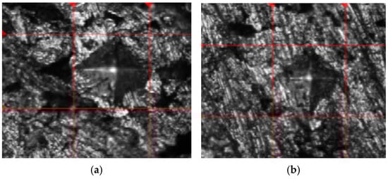 Indentation images for the hardness of sintered Al/Mg/PPA samples (a) first, (b) second image.