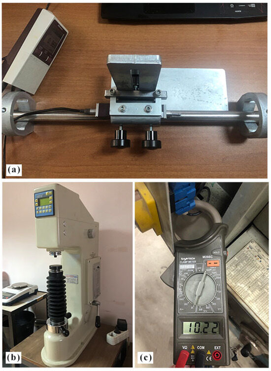 Pictorial view of the devices used for measurement: (a) surface roughness, (b) hardness, and (c) clamp meter.