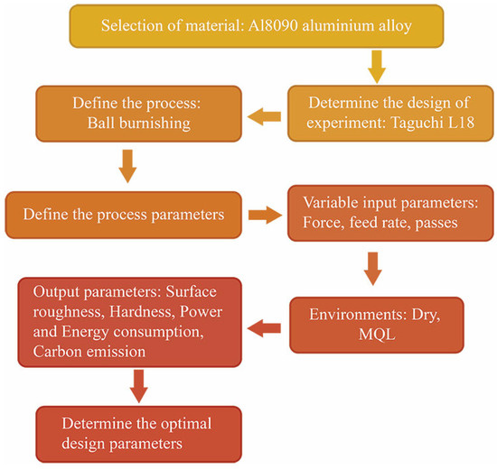 The process parameters of ball burnishing, such as the applied force, feed rate, and number of passes, significantly influence the final surface characteristics [16]. Moreover, the choice of lubrication environment during burnishing, ranging from conventional dry conditions to environmentally conscious MQL, has emerged as a critical factor affecting surface quality, energy consumption, and overall process sustainability [17]. Dry burnishing offers simplicity and cost benefits, yet MQL has gained attention for its potential to reduce environmental impact while maintaining or even enhancing process performance [18]. In particular, MQL aligns with the growing emphasis on sustainable manufacturing practices, balancing process efficiency and environmental responsibility. In today’s manufacturing landscape, where energy efficiency and reduced carbon footprints are increasingly important, integrating sustainability metrics such as power consumption, energy usage, and carbon emission calculations into evaluating surface finishing processes is imperative [19,20].