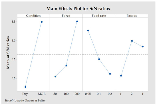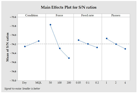 Figure 5 illustrates the main effects of process parameters on the signal-to-noise (S/N) ratio for surface roughness using the “smaller is better” criterion. The MQL environment outperformed dry conditions in reducing surface roughness. Higher forces (200 N) and lower feed rates (0.05 mm/rev) resulted in better surface quality. Additionally, increasing the number of passes improved surface roughness, with two passes being the most effective.