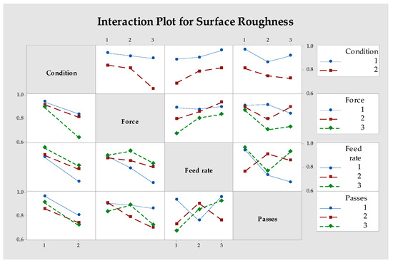 Figure 6 shows the interaction effects between process parameters on surface roughness. Higher forces combined with lower feed rates significantly improved surface roughness. Similarly, increasing the number of passes amplified the positive effects of higher forces. The combination of lower feed rates and more passes resulted in smoother surfaces.