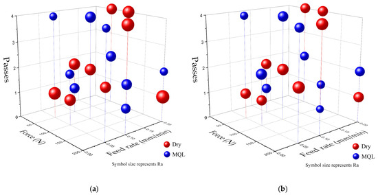 The MQL environment consistently results in lower energy consumption compared to dry conditions. However, the most dramatic effect comes from the number of passes, with energy consumption increasing substantially as the number of passes increases from 1 to 4. This relationship is directly connected to the processing time, as energy consumption is calculated as power multiplied by time [55].