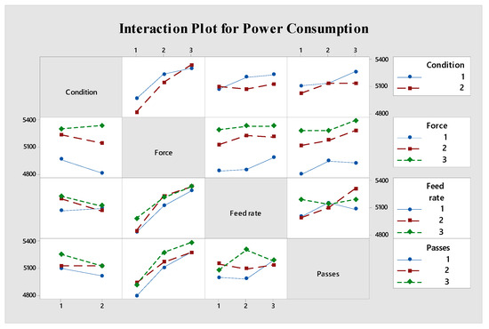 Figure 9 illustrates the interaction effects between different parameters. A notable interaction exists between the environment and force, where the power consumption increases with force and is more pronounced in dry conditions compared to MQL. This suggests that MQL’s lubricating effect becomes more advantageous at higher forces, mitigating the power increase that would otherwise occur [54].