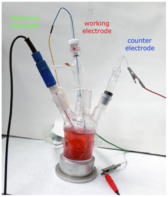 The instrument and the power source (potentiostat/galvanostat and Zero Resistance Ammeter) for electrochemical experiments were combined in one piece of equipment, the Gamry Interface 1000™ (Gamry Instruments Inc., Warminster, PA, USA). The software packages Gamry Framework and Echem Analyst (Version 6.25—both; Gamry Instruments, Warminster, PA, USA) were used for controlling electrochemical experiments, acquiring data, and analyzing experimental data. The electrochemical system in which the experiments were performed consists of an electrochemical cell with three electrodes, which is shown in Figure 1. Three of these electrodes were: saturated calomel electrode (SCE) as a reference, Cu and brass electrodes (area of 1 cm2, 2 mm of thickness) as working, and Pt sheet, with an area of 3 cm2, as a counter. The open circuit potential (OCP) experiment lasted 3600 s (one hour). The linear polarization resistance (LPR) and Tafel extrapolation methods were performed at a scan rate of 10 mV/min. The LPR was performed in the potential limits of ±20 mV from the OCP value, and the Tafel polarization curves were recorded in the range of OCP ± 200 mV. LSV parameters are given further in the text. Preparation of electrode surfaces was performed on Buehler (Buchler GmbH, Braunschweig, Germay) EcoMet 30 Auto/Manual Grinder & Polisher; firstly, they were ground by the use of SiC emery papers from micro grit (ANSI) grade 400 up to 1200, followed by polishing with 1 μm diamond paste. Between phases, and at the end, the samples were washed with double distilled water and finally degreased with petrol ether. The system was thermostated at 25 ± 1 °C.