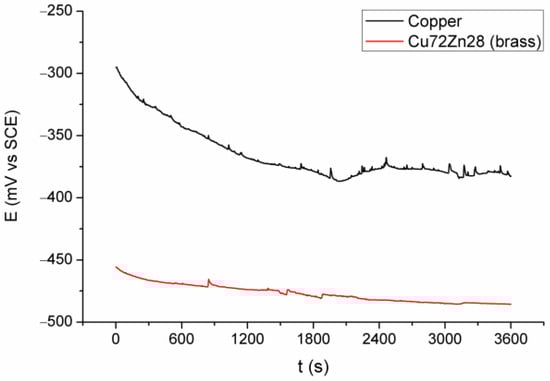 A similar appearance of the curves for Cu and Cu72Zn28 is shown in Figure 2; for both of them, OCP generally decreases with time, and the curves are rough, especially the Cu curve, with many small and sharp peaks and troughs. The curve for the Cu had a small rise after about two thousand seconds before stabilization. Figure 2 also shows that OCP for the Cu electrode is higher for 80–160 mV during the measurement and approximately 100 mV at the end of the measurement.