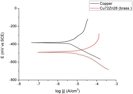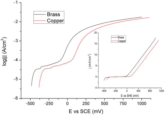 Figure 4 presents the LSV curves for the Cu and brass electrodes.