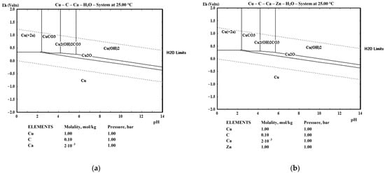 E-pH diagrams constructed for Cu and brass in 0.1M acetic acid (generally the total concentration of all organic acids) with calcium at a concentration of 2.0 mmol/L (80 mg/L) are shown in Figure 5. Previous concentrations are rounded from the actual concentrations in fermented fruit juice of 0.09 M of acetic acid and 75.8 mg/L (ICP analysis) for the calcium to present E-pH diagrams as typical. Both approximations do not affect the E-pH diagram but could be easily expanded in a multi-concentration E-pH diagram, which was the main reason for the procedure. It should be emphasized here that there is naturally a mixture of organic acids in the fermented juice (e.g., malic and citric, which were from the fruit and were not derived from a fermentation). Still, all of them are in small proportions compared to acetic acid. For example, for the proportion of lactic acid to be even slightly significant, a large proportion (or monoculture) of specific strains of bacteria, such as Lactobacillus spp. or Bifidobacterium spp., is required [45]. The same applies to the calcium content since not all of it originated from the fruit but also from added water. The fermented juice contained nearly 10% of the dwell water, which was hard (15.6 °dH, 279 mg/L CaCO3 eq.) and contained 94.3 mg/L of calcium. Figure 5 was drawn in HSC Software (Version 6.12) [46].