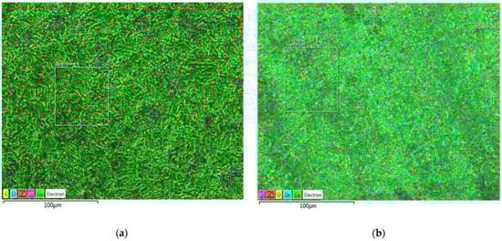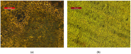 The optical images show a high coverage of the surface of the electrodes (Figure 7) with corrosion products. Optical microscopy exclusively provides information on the color of the surface, which is not the case with SEM imaging. That insight shows the Cu2O (in dark brown or black parts of the surface), but it also indicates the possibility of a mixture with carbonate on the copper specimen (greenish parts of Figure 7a); certainly, hydroxycarbonate and/or carbonate (green parts) for brass and a high probability of the Cu2O existence (dark areas on the surface) on brass (Figure 7b).