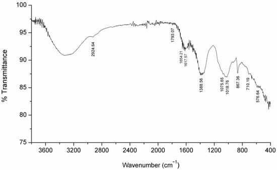 The major bands identified for CaCO3 in the literature were found at 577, 713, 856, 873, 1021, 1082, 1456, 1794, 2515, 2872, 2925, and 3450 cm−1 [56]. The results in Figure 10 are in fair agreement with the typical CaCO3 spectrum, with bands found at 577, 710, 867, 1019, 1076, 1389, 1793 and 2925 cm−1. However, only a sharp and intense band is at 867 cm−1, and to some extent, a band at 1389 cm−1. All other bands are very weak; at 710, 1019, and 2925 cm−1 were shoulder bands. Two peaks (at 1619 and 1654 cm−1) are not characteristic IR bands for CaCO3. The results of the FTIR analysis are consistent with the authors’ assumption that the bands are like this due to the low concentration of CaCO3, which is additionally not evenly distributed over the surface of the sample, and that during analysis, it is difficult to hit the part of the sample where carbonates are dominant. Finally, these bands are probably overlapped with more intense peaks of components in higher concentration. Although the above FTIR results indicate the presence of CaCO3, it is not decisively proven here and the further research is necessary to confirm this possibility.