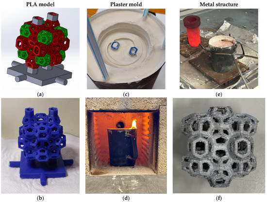 An innovative method for producing such structures is the “lost-PLA” technique [17,42]. This approach, derived from traditional investment casting, combines 3D printing with thermoplastic materials, such as polylactic acid (PLA), with precision casting techniques to achieve complex geometries in metallic or ceramic materials. The process begins with the digital design and production by additive manufacturing of the PLA model, followed by plaster filling of the cavities, removal of the base material through combustion or dissolution, and finally, casting of the molten alloy. This method is particularly suitable for reproducing intricate structures like the Weaire–Phelan configuration, which would otherwise be challenging or impossible to fabricate using conventional techniques.