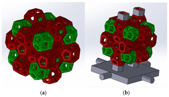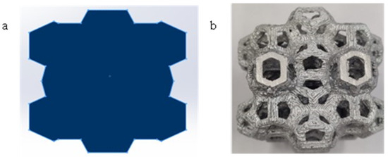 (a) Structure with Weaire–Phelan cells for compression tests; (b) structure with Weaire–Phelan cells for compression test with supports employed for casting phase.