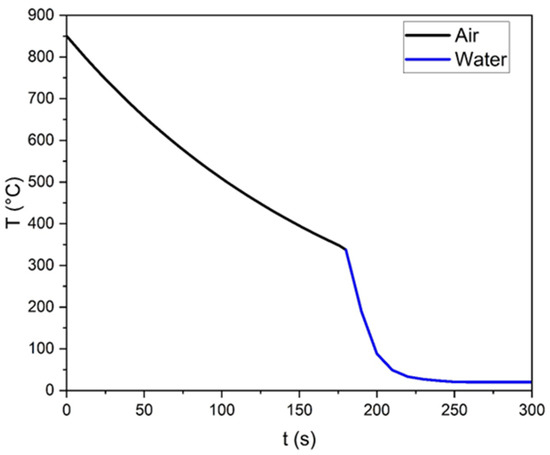 Once the plaster mold is completely dry, the oven, with the mold inside, is heated up to 900 °C, and the aluminum alloy billet (EN AW 6082) is heated up in a separate furnace set at 850 °C. When both furnaces reach the target temperatures, a type k thermocouple is placed in the plaster mold through one of the venting channels and casting begins. Till the alloy is in the molten state, vibrations are applied to the mold to promote air release and prevent clogging of the casting channels. Once solidification is completed, the sample is quickly cooled by immersion in water. At room temperature, the model is cleaned by removing excess plaster and by trimming the bases and allowances formed during the casting process. The temperature vs time profile of a typical solidification process is shown in Figure 4.