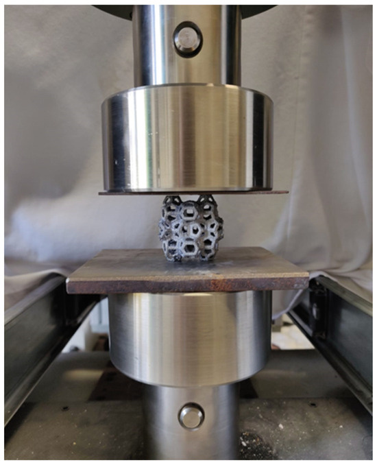 All samples underwent compression testing using a 50 kN tensile-compression MTS Machine (Eden Prairie, MN, USA), with the testing parameters set to a crosshead speed of 6 mm/s and a maximum applied load of 48 kN (Figure 5). For each test, three samples were characterized, and the average values were considered.
