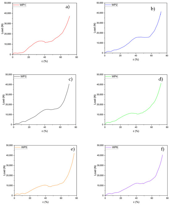 Although sample WP2 exhibited an incomplete structure, this does not seem to affect the curve’s behavior, as the graph closely overlaps with the curve of WP3, which was fully intact. The curve for sample WP4 is the only one that significantly deviates from the profiles of the other three under identical compression conditions. It appears to follow a trend more similar to the curves for samples WP1 and WP5, as shown in Figure 12, even though these were tested with the load applied parallel to the layer planes.