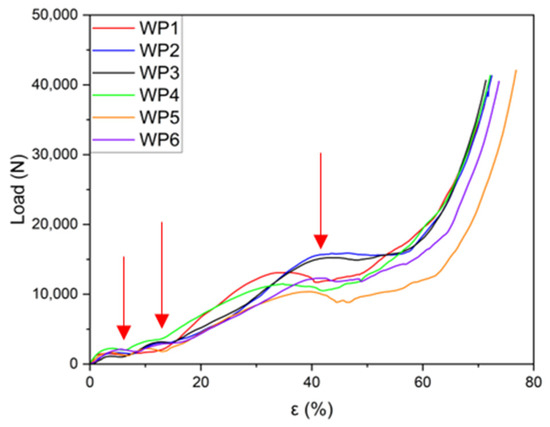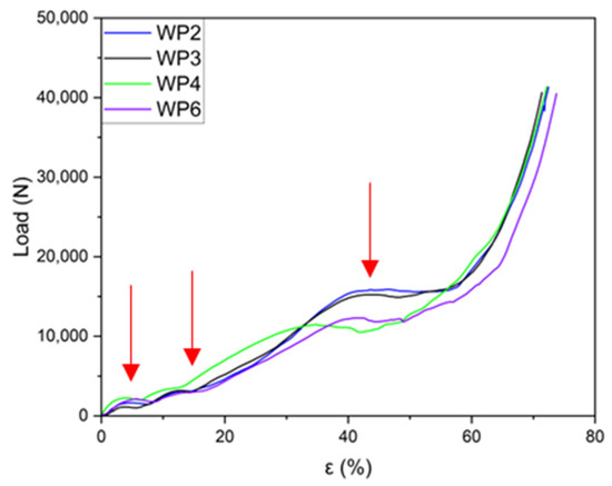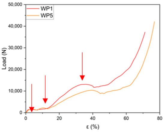 Load–strain curves for the samples (WP1 and WP5) compressed laterally, with the planes of the layers parallel to the applied load. (Plateau loads indicated by red arrows).
