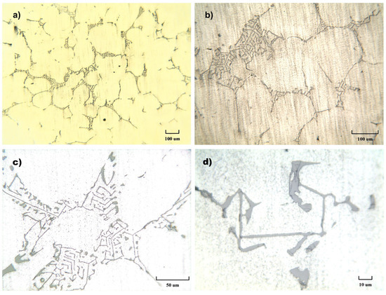 Microstructures of the AA 6082 alloy after the casting process at 100× (a), 200× (b), 500× (c), and 1000× (d).