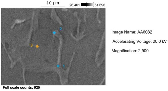 The micrographs in Figure 14a–d show the microstructure of the Al 6082 alloy at different magnifications, ranging from 100× to 1000×: an interdendritic space of the α-Al solid solution and the precipitates of the intermetallic phases. The latter consist of Mg2Si, β-AlFeSi, and α-AlFeMnSi. The metallographic structures are in good agreement with the literature [44] on as-cast alloys. A SEM micrograph (2500×) is reported in Figure 15, and EDS analysis results on points 1–3 are reported in Table 8.
