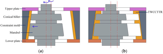 Constraint ring rolling (CRR) is a new plastic forming technique, and it is very applicable for forming TWCCTRR [4]. In the CRR of TWCCTRR, the outer radius and axial height of conical billet do not change under the role of constraint mold and upper/lower plate, as shown in Figure 1, by which the forming stability can be guaranteed, and meanwhile, much material is enforced to flow axially. Through the coordinated motion of molds (i.e., both the constraint mold and upper/lower mold rotate along their axes, and the mandrel translates radially and meanwhile rotates along its axis), the conical billet is gradually formed into TWCCTRR, and consequently, TWCCTRR can obtain refined grains and complete material streamlines. Owning to the above principle, CRR has great potential in forming high-performance TWCCTRR.