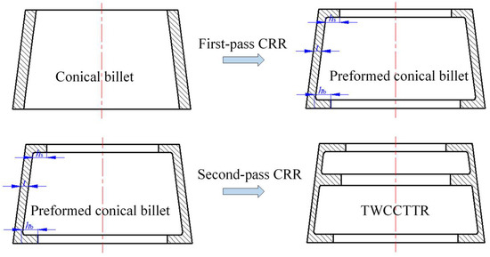 From the above analysis, we found that the cause of UMF occurring in single-pass CRR of TWCCTRR is that the rib at the small part is completely filled, the latest among the three ribs. If the three ribs could be completely filled simultaneously, UMF may be avoided in the CRR of TWCCTRR. Motivated by this idea, the double-pass CRR process is proposed in this paper to form TWCCTRR without UMF; that is, a conical billet is rolled into a preformed conical billet that has two inner ring ribs (their widths are all 15 mm) at the small and large parts through first-pass CRR, and then the preformed conical billet is rolled into the target TWCCTRR through the second-pass CRR, as shown in Figure 6. Importantly, the height of the two ribs, as well as the wall thickness of the skin for the preformed conical billet, determine if the three ribs of TWCCTRR can be completely filled simultaneously in the second-pass CRR. Therefore, precisely designing the preformed conical billet is critical to avoiding UMF in the double-pass CRR of TWCCTRR.