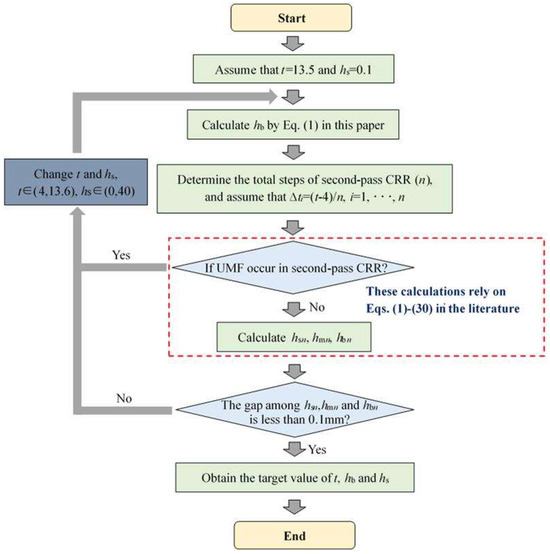 To ensure that the three ribs of target TWCCTRR can be completely filled simultaneously, the precise calculation method of key parameters t, hs and hb is proposed, by which these key parameters can be quickly determined. As shown in Figure 7, the proposed calculation method mainly contains the following procedures: (1) assign an initial value for parameters t and hs, calculate hb based on Equation (1), determine the total forming steps of the second-pass CRR (n), and assume that the reduction amount of radial wall thickness of the skin in the ith forming step (∆ti) is the same (i in Figure 7 denotes the number of forming step for the second-pass CRR); (2) in reference to Equations (1)–(30) in the literature [4], judge if UMF would occur in each forming step (once UMF occurs, immediately change the values of t and hs, and repeat the above procedures); (3) if UMF does not occur in each forming step, calculate the height of the three ribs in the last forming step by means of Equations (1)–(30) in the literature [4] (hsn, hmn and hbn respectively denote the height of the rib at the small, middle and large parts in the last forming step); (4) judge if the gap among hsn, hmn and hbn is less than 0.1 mm (once the gap is not less than 0.1 mm, immediately change the values of t and hs and repeat the above procedures); (5) if the gap among hsn, hmn and hbn is less than 0.1 mm, output the final value of t, hs and hb.