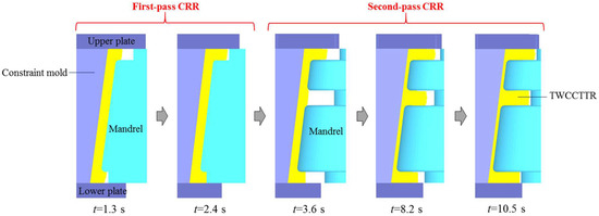 Through FE simulation, the shape revolution rules of deformed TWCCTRR during double-pass CRR of TWCCTRR are displayed in Figure 8. In the stage of the first-pass CRR, the two ribs at the small and large parts almost grow simultaneously before they are completely filled, the cause of which has been explained in the literature [7]. When the rolling time t ≈ 1.5 s, the rib at the large part is completely filled firstly because the target height of this rib (11.2 mm) is much smaller than that of the rib at the small part (22 mm). Subsequently, as the wall thickness of the skin continues to decrease, the height of the rib at the large part remains unchanged because this rib is completely filled, and thus, the material in the loading area of the skin is forced to flow toward the rib at the small part. At the end of the first-pass CRR, the rib at the small part is basically completely filled (its height basically reaches 22 mm). Owning to the above material flow mode, UMF does not occur at the two ribs located at the large and small parts during the first-pass CRR [4].