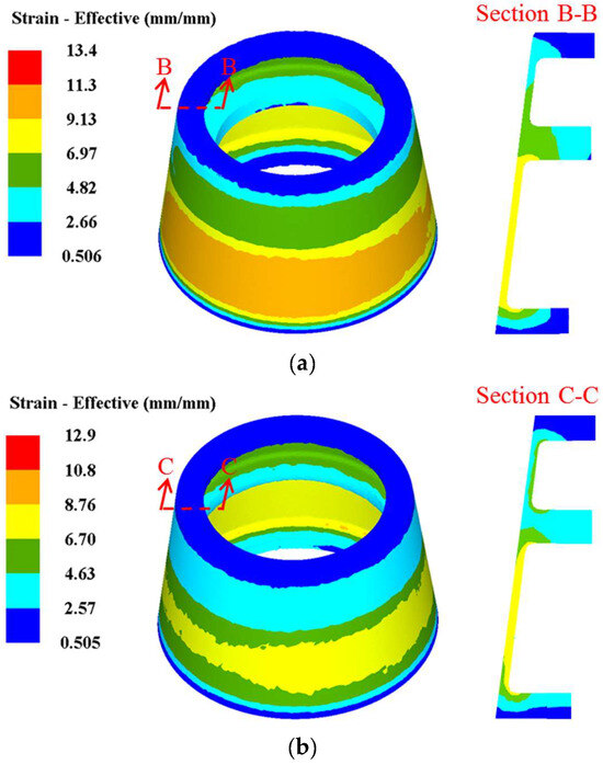 Based on the FE simulation, the distribution rules of effective strain in TWCCTRR formed by single-pass/double-pass CRR are respectively displayed in Figure 10a,b. Figure 10a,b show that when single-pass CRR and double-pass CRR are accomplished, the distribution of effective strain along the axial/radial direction is highly uneven, and the distribution of effective strain along the circumferential direction is relatively uniform. The effective strain in the lower loading area of the skin is the maximum, and the effective strain around the end surfaces of the two ribs at the large and small parts is the minimum. From the bottom of the three ribs to their roofs, the effective strain basically presents a gradual decrement trend. Additionally, the effective strain in the upper loading area of the skin is significantly less than that in the lower loading area of the skin, and the effective strain around the roof of the rib at the middle part is much larger than that around the roofs of the two ribs at the large and small parts.