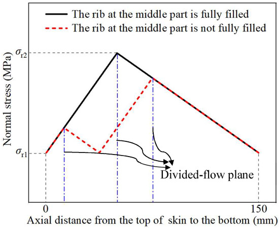 Through comparing Figure 10a,b, it is found that the maximum effective strain in TWCCTRR formed by single-pass CRR is obviously larger than that in TWCCTRR formed by double-pass CRR, while the minimum effective strain in TWCCTRR formed by single-pass/double-pass CRR is basically the same. This demonstrates that in contrast to single-pass CRR, the plastic deformation in TWCCTRR formed by double-pass CRR is more uniform, which can be explained by the stress state of the loading area of the skin. In reference to the slab stress method [7], the schematic diagram of normal stress distribution in the loading area of the skin during the first-pass/second-pass CRR of TWCCTRR is drawn in Figure 11. It shows that when the rib at the middle part is not completely filled, the material in the upper and lower loading areas of the skin flows together to this rib, and thus, there exists a divided-flow plane in the upper/lower loading area of the skin (the normal stress on the divided-flow plane is the largest around the divided-flow plane). After the rib at the middle part is completely filled, a divided-flow plane only exists in the loading area of the skin. Figure 11 shows that with increasing the number of divided-flow planes in the skin, the maximum normal stress obviously decreases while the minimum normal stress remains unchanged. For the single-pass CRR of TWCCTRR, the number of divided-flow planes is changed from 1 to 2 after the rib at the large part is completely filled first. For the double-pass CRR of TWCCTRR, two divided-flow planes still exist in the skin because the three ribs are filled simultaneously. Based on the above analysis, it is illustrated that the distribution of normal stress on the skin in the final stage of the single-pass CRR is more uneven in contrast to double-pass CRR. Therefore, the distribution of plastic deformation in TWCCTRR formed by double-pass CRR is more uniform than that of first-pass CRR.